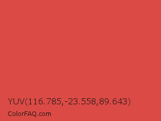 YUV 116.785,-23.558,89.643 Color is a normal red color and the nearest color is Valencia #d84437. Hex code #db4a45 and RGB value is rgb(219,74,69). In RGB color space, this color is composed of 86% red, 29% green, 27% blue, In CMYK color space, this color is composed of 0% cyan, 66% magenta, 68% yellow , 14% black , In HSL color space, this color has a hue angle of 2° , 68% saturation and 56% lightness.