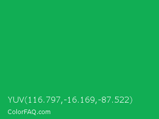 YUV 116.797,-16.169,-87.522 Color is a normal green color and the nearest color is Green Pigment #00a550. Hex code #11ae54 and RGB value is rgb(17,174,84). In RGB color space, this color is composed of 7% red, 68% green, 33% blue, In CMYK color space, this color is composed of 90% cyan, 0% magenta, 52% yellow , 32% black , In HSL color space, this color has a hue angle of 146° , 82% saturation and 37% lightness.
