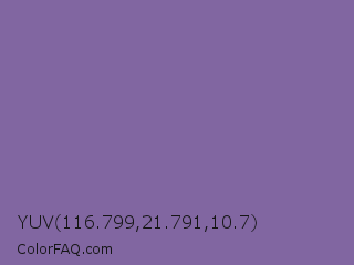 YUV 116.799,21.791,10.7 Color is a normal violet color and the nearest color is Deluge #7563a8. Hex code #8166a1 and RGB value is rgb(129,102,161). In RGB color space, this color is composed of 51% red, 40% green, 63% blue, In CMYK color space, this color is composed of 20% cyan, 37% magenta, 0% yellow , 37% black , In HSL color space, this color has a hue angle of 267° , 24% saturation and 52% lightness.