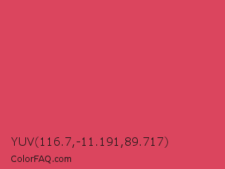 YUV 116.7,-11.191,89.717 Color is a normal red color and the nearest color is Paradise Pink #e63e62. Hex code #db455e and RGB value is rgb(219,69,94). In RGB color space, this color is composed of 86% red, 27% green, 37% blue, In CMYK color space, this color is composed of 0% cyan, 68% magenta, 57% yellow , 14% black , In HSL color space, this color has a hue angle of 350° , 68% saturation and 56% lightness.