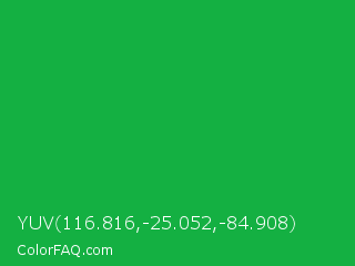 YUV 116.816,-25.052,-84.908 Color is a normal green color and the nearest color is Green Pantone #00ad43. Hex code #14b042 and RGB value is rgb(20,176,66). In RGB color space, this color is composed of 8% red, 69% green, 26% blue, In CMYK color space, this color is composed of 89% cyan, 0% magenta, 63% yellow , 31% black , In HSL color space, this color has a hue angle of 138° , 80% saturation and 38% lightness.
