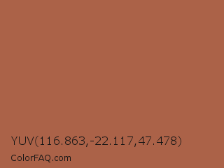 YUV 116.863,-22.117,47.478 Color is a normal orange color and the nearest color is Cape Palliser #a26645. Hex code #ab6248 and RGB value is rgb(171,98,72). In RGB color space, this color is composed of 67% red, 38% green, 28% blue, In CMYK color space, this color is composed of 0% cyan, 43% magenta, 58% yellow , 33% black , In HSL color space, this color has a hue angle of 16° , 41% saturation and 48% lightness.