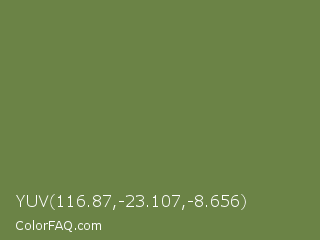YUV 116.87,-23.107,-8.656 Color is a normal green color and the nearest color is Dingley #5d7747. Hex code #6b8346 and RGB value is rgb(107,131,70). In RGB color space, this color is composed of 42% red, 51% green, 27% blue, In CMYK color space, this color is composed of 18% cyan, 0% magenta, 47% yellow , 49% black , In HSL color space, this color has a hue angle of 84° , 30% saturation and 39% lightness.