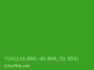 YUV 116.899,-40.869,-51.654 Color is a normal green color and the nearest color is Wageningen Green #34b233. Hex code #3aa322 and RGB value is rgb(58,163,34). In RGB color space, this color is composed of 23% red, 64% green, 13% blue, In CMYK color space, this color is composed of 64% cyan, 0% magenta, 79% yellow , 36% black , In HSL color space, this color has a hue angle of 109° , 65% saturation and 39% lightness.