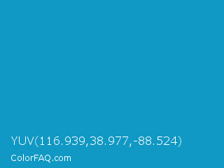 YUV 116.939,38.977,-88.524 Color is a normal blue color and the nearest color is Blue Green #0d98ba. Hex code #1099c4 and RGB value is rgb(16,153,196). In RGB color space, this color is composed of 6% red, 60% green, 77% blue, In CMYK color space, this color is composed of 92% cyan, 22% magenta, 0% yellow , 23% black , In HSL color space, this color has a hue angle of 194° , 85% saturation and 42% lightness.