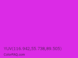YUV 116.942,55.738,89.505 Color is a normal magenta color and the nearest color is Steel Pink #cc33cc. Hex code #db2be6 and RGB value is rgb(219,43,230). In RGB color space, this color is composed of 86% red, 17% green, 90% blue, In CMYK color space, this color is composed of 5% cyan, 81% magenta, 0% yellow , 10% black , In HSL color space, this color has a hue angle of 296° , 79% saturation and 54% lightness.