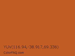 YUV 116.94,-38.917,69.336 Color is a normal orange color and the nearest color is Piper #c96323. Hex code #c45c26 and RGB value is rgb(196,92,38). In RGB color space, this color is composed of 77% red, 36% green, 15% blue, In CMYK color space, this color is composed of 0% cyan, 53% magenta, 81% yellow , 23% black , In HSL color space, this color has a hue angle of 21° , 68% saturation and 46% lightness.