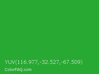 YUV 116.977,-32.527,-67.509 Color is a normal green color and the nearest color is Wageningen Green #34b233. Hex code #28a933 and RGB value is rgb(40,169,51). In RGB color space, this color is composed of 16% red, 66% green, 20% blue, In CMYK color space, this color is composed of 76% cyan, 0% magenta, 70% yellow , 34% black , In HSL color space, this color has a hue angle of 125° , 62% saturation and 41% lightness.