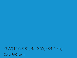 YUV 116.981,45.365,-84.175 Color is a normal blue color and the nearest color is Rich Electric Blue #0892d0. Hex code #1594d1 and RGB value is rgb(21,148,209). In RGB color space, this color is composed of 8% red, 58% green, 82% blue, In CMYK color space, this color is composed of 90% cyan, 29% magenta, 0% yellow , 18% black , In HSL color space, this color has a hue angle of 199° , 82% saturation and 45% lightness.