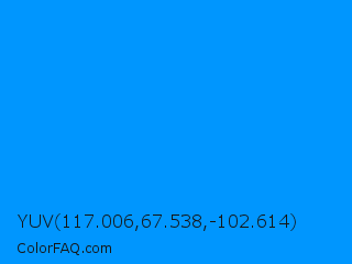 YUV 117.006,67.538,-102.614 Color is a normal blue color and the nearest color is Azure Radiance #007fff. Hex code #0096fe and RGB value is rgb(0,150,254). In RGB color space, this color is composed of 0% red, 59% green, 100% blue, In CMYK color space, this color is composed of 100% cyan, 41% magenta, 0% yellow , 0% black , In HSL color space, this color has a hue angle of 205° , 100% saturation and 50% lightness.