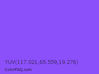 YUV 117.021,65.559,19.276 Color is a light violet color and the nearest color is Navy Purple #9457eb. Hex code #8b50fa and RGB value is rgb(139,80,250). In RGB color space, this color is composed of 55% red, 31% green, 98% blue, In CMYK color space, this color is composed of 44% cyan, 68% magenta, 0% yellow , 2% black , In HSL color space, this color has a hue angle of 261° , 94% saturation and 65% lightness.