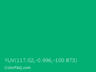 YUV 117.02,-0.996,-100.873 Color is a normal green color and the nearest color is Green Munsell #00a877. Hex code #02b073 and RGB value is rgb(2,176,115). In RGB color space, this color is composed of 1% red, 69% green, 45% blue, In CMYK color space, this color is composed of 99% cyan, 0% magenta, 35% yellow , 31% black , In HSL color space, this color has a hue angle of 159° , 98% saturation and 35% lightness.