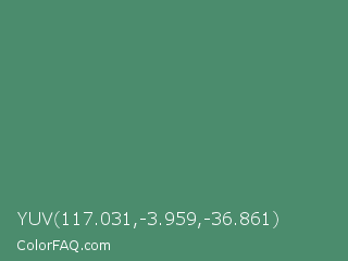 YUV 117.031,-3.959,-36.861 Color is a normal green color and the nearest color is Viridian #40826d. Hex code #4b8c6d and RGB value is rgb(75,140,109). In RGB color space, this color is composed of 29% red, 55% green, 43% blue, In CMYK color space, this color is composed of 46% cyan, 0% magenta, 22% yellow , 45% black , In HSL color space, this color has a hue angle of 151° , 30% saturation and 42% lightness.