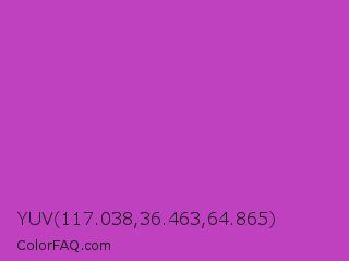 YUV 117.038,36.463,64.865 Color is a normal magenta color and the nearest color is Fuchsia Pink #c154c1. Hex code #bf41bf and RGB value is rgb(191,65,191). In RGB color space, this color is composed of 75% red, 25% green, 75% blue, In CMYK color space, this color is composed of 0% cyan, 66% magenta, 0% yellow , 25% black , In HSL color space, this color has a hue angle of 300° , 50% saturation and 50% lightness.