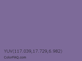 YUV 117.039,17.729,6.982 Color is a normal violet color and the nearest color is Kimberly #736c9f. Hex code #7d6a99 and RGB value is rgb(125,106,153). In RGB color space, this color is composed of 49% red, 42% green, 60% blue, In CMYK color space, this color is composed of 18% cyan, 31% magenta, 0% yellow , 40% black , In HSL color space, this color has a hue angle of 264° , 19% saturation and 51% lightness.