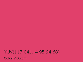 YUV 117.041,-4.95,94.68 Color is a normal rose color and the nearest color is Paradise Pink #e63e62. Hex code #e1406b and RGB value is rgb(225,64,107). In RGB color space, this color is composed of 88% red, 25% green, 42% blue, In CMYK color space, this color is composed of 0% cyan, 72% magenta, 52% yellow , 12% black , In HSL color space, this color has a hue angle of 344° , 73% saturation and 57% lightness.