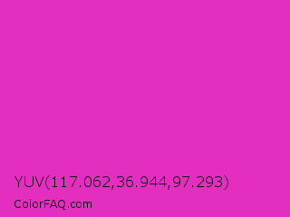 YUV 117.062,36.944,97.293 Color is a normal magenta color and the nearest color is Frostbite #e936a7. Hex code #e42ec0 and RGB value is rgb(228,46,192). In RGB color space, this color is composed of 89% red, 18% green, 75% blue, In CMYK color space, this color is composed of 0% cyan, 80% magenta, 16% yellow , 11% black , In HSL color space, this color has a hue angle of 312° , 77% saturation and 54% lightness.