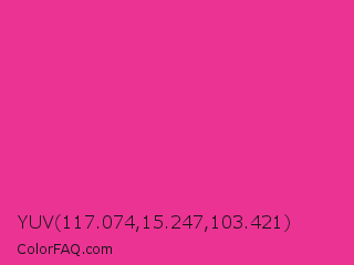 YUV 117.074,15.247,103.421 Color is a normal rose color and the nearest color is Cerise Pink #ec3b83. Hex code #eb3394 and RGB value is rgb(235,51,148). In RGB color space, this color is composed of 92% red, 20% green, 58% blue, In CMYK color space, this color is composed of 0% cyan, 78% magenta, 37% yellow , 8% black , In HSL color space, this color has a hue angle of 328° , 82% saturation and 56% lightness.