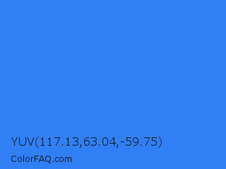 YUV 117.13,63.04,-59.75 Color is a normal blue color and the nearest color is Bleu De France #318ce7. Hex code #317ff5 and RGB value is rgb(49,127,245). In RGB color space, this color is composed of 19% red, 50% green, 96% blue, In CMYK color space, this color is composed of 80% cyan, 48% magenta, 0% yellow , 4% black , In HSL color space, this color has a hue angle of 216° , 91% saturation and 58% lightness.