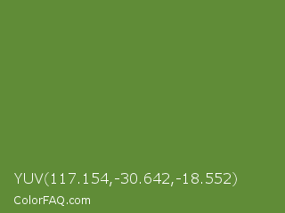 YUV 117.154,-30.642,-18.552 Color is a normal green color and the nearest color is Maximum Green #5e8c31. Hex code #608c37 and RGB value is rgb(96,140,55). In RGB color space, this color is composed of 38% red, 55% green, 22% blue, In CMYK color space, this color is composed of 31% cyan, 0% magenta, 61% yellow , 45% black , In HSL color space, this color has a hue angle of 91° , 44% saturation and 38% lightness.