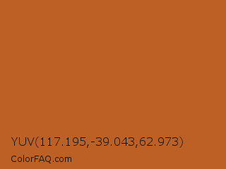 YUV 117.195,-39.043,62.973 Color is a normal orange color and the nearest color is Ruddy Brown #bb6528. Hex code #bd6026 and RGB value is rgb(189,96,38). In RGB color space, this color is composed of 74% red, 38% green, 15% blue, In CMYK color space, this color is composed of 0% cyan, 49% magenta, 80% yellow , 26% black , In HSL color space, this color has a hue angle of 23° , 67% saturation and 45% lightness.