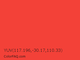 YUV 117.196,-30.17,110.33 Color is a normal red color and the nearest color is Red Orange #ff3f34. Hex code #f34138 and RGB value is rgb(243,65,56). In RGB color space, this color is composed of 95% red, 25% green, 22% blue, In CMYK color space, this color is composed of 0% cyan, 73% magenta, 77% yellow , 5% black , In HSL color space, this color has a hue angle of 3° , 89% saturation and 59% lightness.