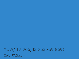 YUV 117.266,43.253,-59.869 Color is a normal blue color and the nearest color is Curious Blue #2596d1. Hex code #3187cd and RGB value is rgb(49,135,205). In RGB color space, this color is composed of 19% red, 53% green, 80% blue, In CMYK color space, this color is composed of 76% cyan, 34% magenta, 0% yellow , 20% black , In HSL color space, this color has a hue angle of 207° , 61% saturation and 50% lightness.
