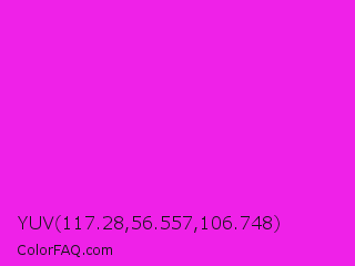 YUV 117.28,56.557,106.748 Color is a normal magenta color and the nearest color is Hot Magenta #ff1dce. Hex code #ef21e8 and RGB value is rgb(239,33,232). In RGB color space, this color is composed of 94% red, 13% green, 91% blue, In CMYK color space, this color is composed of 0% cyan, 86% magenta, 3% yellow , 6% black , In HSL color space, this color has a hue angle of 302° , 87% saturation and 53% lightness.