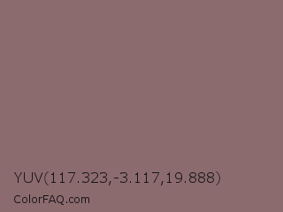 YUV 117.323,-3.117,19.888 Color is a normal red color and the nearest color is Opium #8e6f70. Hex code #8c6b6f and RGB value is rgb(140,107,111). In RGB color space, this color is composed of 55% red, 42% green, 44% blue, In CMYK color space, this color is composed of 0% cyan, 24% magenta, 21% yellow , 45% black , In HSL color space, this color has a hue angle of 353° , 13% saturation and 48% lightness.