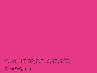 YUV 117.32,8.716,97.943 Color is a normal rose color and the nearest color is Cerise Pink #ec3b83. Hex code #e53987 and RGB value is rgb(229,57,135). In RGB color space, this color is composed of 90% red, 22% green, 53% blue, In CMYK color space, this color is composed of 0% cyan, 75% magenta, 41% yellow , 10% black , In HSL color space, this color has a hue angle of 333° , 77% saturation and 56% lightness.