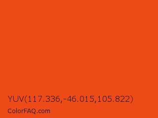 YUV 117.336,-46.015,105.822 Color is a normal red color and the nearest color is Pomegranate #f34723. Hex code #ee4a18 and RGB value is rgb(238,74,24). In RGB color space, this color is composed of 93% red, 29% green, 9% blue, In CMYK color space, this color is composed of 0% cyan, 69% magenta, 90% yellow , 7% black , In HSL color space, this color has a hue angle of 14° , 86% saturation and 51% lightness.