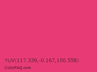 YUV 117.339,-0.167,100.558 Color is a normal rose color and the nearest color is Cerise Pink #ec3b83. Hex code #e83b75 and RGB value is rgb(232,59,117). In RGB color space, this color is composed of 91% red, 23% green, 46% blue, In CMYK color space, this color is composed of 0% cyan, 75% magenta, 50% yellow , 9% black , In HSL color space, this color has a hue angle of 340° , 79% saturation and 57% lightness.