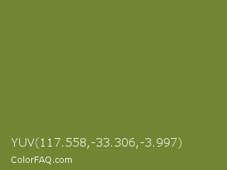 YUV 117.558,-33.306,-3.997 Color is a normal lime color and the nearest color is Wasabi #788a25. Hex code #718532 and RGB value is rgb(113,133,50). In RGB color space, this color is composed of 44% red, 52% green, 20% blue, In CMYK color space, this color is composed of 15% cyan, 0% magenta, 62% yellow , 48% black , In HSL color space, this color has a hue angle of 74° , 45% saturation and 36% lightness.
