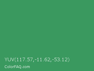 YUV 117.57,-11.62,-53.12 Color is a normal green color and the nearest color is Chateau Green #40a860. Hex code #39995e and RGB value is rgb(57,153,94). In RGB color space, this color is composed of 22% red, 60% green, 37% blue, In CMYK color space, this color is composed of 63% cyan, 0% magenta, 39% yellow , 40% black , In HSL color space, this color has a hue angle of 143° , 46% saturation and 41% lightness.