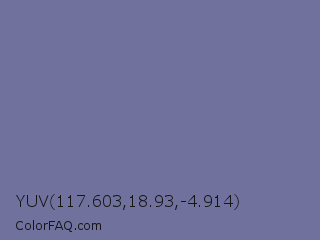 YUV 117.603,18.93,-4.914 Color is a normal blue color and the nearest color is Kimberly #736c9f. Hex code #70719c and RGB value is rgb(112,113,156). In RGB color space, this color is composed of 44% red, 44% green, 61% blue, In CMYK color space, this color is composed of 28% cyan, 28% magenta, 0% yellow , 39% black , In HSL color space, this color has a hue angle of 239° , 18% saturation and 53% lightness.