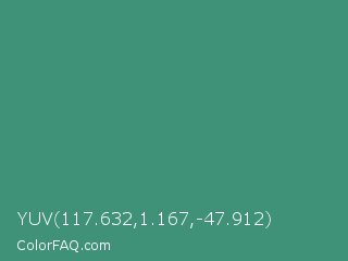 YUV 117.632,1.167,-47.912 Color is a normal green color and the nearest color is Illuminating Emerald #319177. Hex code #3f9178 and RGB value is rgb(63,145,120). In RGB color space, this color is composed of 25% red, 57% green, 47% blue, In CMYK color space, this color is composed of 57% cyan, 0% magenta, 17% yellow , 43% black , In HSL color space, this color has a hue angle of 162° , 39% saturation and 41% lightness.