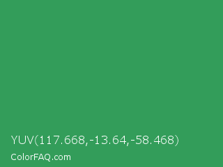 YUV 117.668,-13.64,-58.468 Color is a normal green color and the nearest color is Chateau Green #40a860. Hex code #339d5a and RGB value is rgb(51,157,90). In RGB color space, this color is composed of 20% red, 62% green, 35% blue, In CMYK color space, this color is composed of 68% cyan, 0% magenta, 43% yellow , 38% black , In HSL color space, this color has a hue angle of 142° , 51% saturation and 41% lightness.