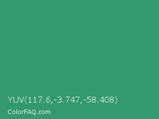 YUV 117.6,-3.747,-58.408 Color is a normal green color and the nearest color is Illuminating Emerald #319177. Hex code #33996e and RGB value is rgb(51,153,110). In RGB color space, this color is composed of 20% red, 60% green, 43% blue, In CMYK color space, this color is composed of 67% cyan, 0% magenta, 28% yellow , 40% black , In HSL color space, this color has a hue angle of 155° , 50% saturation and 40% lightness.