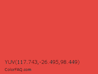 YUV 117.743,-26.495,98.449 Color is a normal red color and the nearest color is Carmine Pink #eb4c42. Hex code #e64740 and RGB value is rgb(230,71,64). In RGB color space, this color is composed of 90% red, 28% green, 25% blue, In CMYK color space, this color is composed of 0% cyan, 69% magenta, 72% yellow , 10% black , In HSL color space, this color has a hue angle of 3° , 77% saturation and 58% lightness.