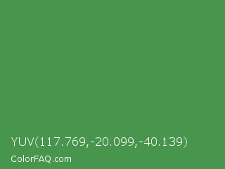 YUV 117.769,-20.099,-40.139 Color is a normal green color and the nearest color is May Green #4c9141. Hex code #48954d and RGB value is rgb(72,149,77). In RGB color space, this color is composed of 28% red, 58% green, 30% blue, In CMYK color space, this color is composed of 52% cyan, 0% magenta, 48% yellow , 42% black , In HSL color space, this color has a hue angle of 124° , 35% saturation and 43% lightness.