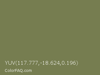 YUV 117.777,-18.624,0.196 Color is a normal yellow color and the nearest color is Go Ben #726d4e. Hex code #767d50 and RGB value is rgb(118,125,80). In RGB color space, this color is composed of 46% red, 49% green, 31% blue, In CMYK color space, this color is composed of 6% cyan, 0% magenta, 36% yellow , 51% black , In HSL color space, this color has a hue angle of 69° , 22% saturation and 40% lightness.