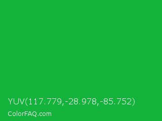 YUV 117.779,-28.978,-85.752 Color is a normal green color and the nearest color is Dark Pastel Green #03c03c. Hex code #14b33b and RGB value is rgb(20,179,59). In RGB color space, this color is composed of 8% red, 70% green, 23% blue, In CMYK color space, this color is composed of 89% cyan, 0% magenta, 67% yellow , 30% black , In HSL color space, this color has a hue angle of 135° , 80% saturation and 39% lightness.