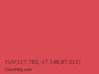 YUV 117.783,-17.148,87.013 Color is a normal red color and the nearest color is English Vermillion #cc474b. Hex code #d94a53 and RGB value is rgb(217,74,83). In RGB color space, this color is composed of 85% red, 29% green, 33% blue, In CMYK color space, this color is composed of 0% cyan, 66% magenta, 62% yellow , 15% black , In HSL color space, this color has a hue angle of 356° , 65% saturation and 57% lightness.