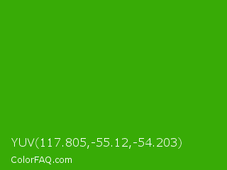 YUV 117.805,-55.12,-54.203 Color is a normal green color and the nearest color is Kelly Green #4cbb17. Hex code #38ab06 and RGB value is rgb(56,171,6). In RGB color space, this color is composed of 22% red, 67% green, 2% blue, In CMYK color space, this color is composed of 67% cyan, 0% magenta, 96% yellow , 33% black , In HSL color space, this color has a hue angle of 102° , 93% saturation and 35% lightness.