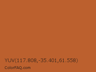 YUV 117.808,-35.401,61.558 Color is a normal orange color and the nearest color is Tuscany #bd5e2e. Hex code #bc602e and RGB value is rgb(188,96,46). In RGB color space, this color is composed of 74% red, 38% green, 18% blue, In CMYK color space, this color is composed of 0% cyan, 49% magenta, 76% yellow , 26% black , In HSL color space, this color has a hue angle of 21° , 61% saturation and 46% lightness.