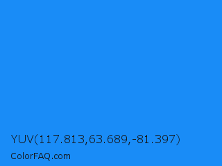YUV 117.813,63.689,-81.397 Color is a normal blue color and the nearest color is Dodger Blue #1e90ff. Hex code #198cf7 and RGB value is rgb(25,140,247). In RGB color space, this color is composed of 10% red, 55% green, 97% blue, In CMYK color space, this color is composed of 90% cyan, 43% magenta, 0% yellow , 3% black , In HSL color space, this color has a hue angle of 209° , 93% saturation and 53% lightness.