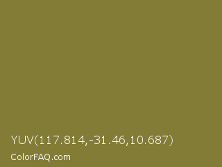 YUV 117.814,-31.46,10.687 Color is a normal yellow color and the nearest color is Old Moss Green #867e36. Hex code #827c36 and RGB value is rgb(130,124,54). In RGB color space, this color is composed of 51% red, 49% green, 21% blue, In CMYK color space, this color is composed of 0% cyan, 5% magenta, 58% yellow , 49% black , In HSL color space, this color has a hue angle of 55° , 41% saturation and 36% lightness.