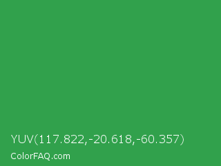 YUV 117.822,-20.618,-60.357 Color is a normal green color and the nearest color is Sea Green #2e8b57. Hex code #31a14c and RGB value is rgb(49,161,76). In RGB color space, this color is composed of 19% red, 63% green, 30% blue, In CMYK color space, this color is composed of 70% cyan, 0% magenta, 53% yellow , 37% black , In HSL color space, this color has a hue angle of 134° , 53% saturation and 41% lightness.