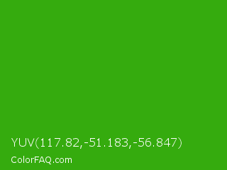 YUV 117.82,-51.183,-56.847 Color is a normal green color and the nearest color is Slimy Green #299617. Hex code #35ab0e and RGB value is rgb(53,171,14). In RGB color space, this color is composed of 21% red, 67% green, 5% blue, In CMYK color space, this color is composed of 69% cyan, 0% magenta, 92% yellow , 33% black , In HSL color space, this color has a hue angle of 105° , 85% saturation and 36% lightness.