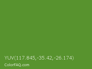 YUV 117.845,-35.42,-26.174 Color is a normal green color and the nearest color is Maximum Green #5e8c31. Hex code #58932e and RGB value is rgb(88,147,46). In RGB color space, this color is composed of 35% red, 58% green, 18% blue, In CMYK color space, this color is composed of 40% cyan, 0% magenta, 69% yellow , 42% black , In HSL color space, this color has a hue angle of 95° , 52% saturation and 38% lightness.
